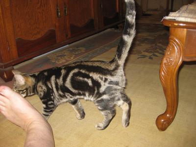 He is very intelligent, fast and has bonded to me like glue. he likes to carry things around in his mouth and will shake them like a dog as if he is trying to kill something.
